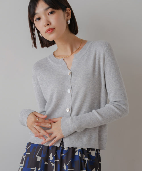 ベーシックなショートカーデを、デコルテをキレイに魅せるキーネックで知的な印象に仕上げました。上品なルックスを叶える細番手のメリヤス編みで、薄すぎない適度な生地感は季節の変わり目に重宝します。