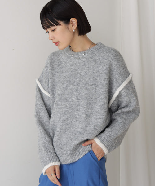 配色とミックス調の色身が特徴的なローゲージニット。 ゆったりとしたサイズ感でカジュアルに着こなせます。 肩と袖口の部分配色でさりげないワンポイントがオシャレな1枚です。