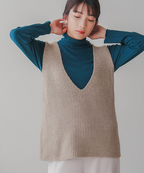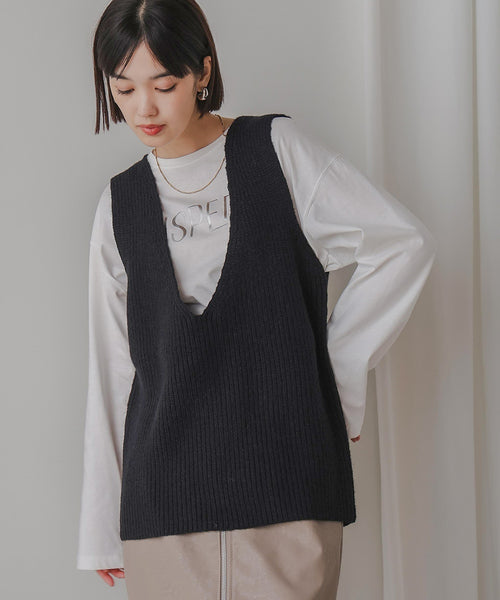 深いVネックが印象的なリブニットベスト!いつものコーディネートに少し物足りなさを感じるときに、気軽に取り入れて頂ける1枚です。安心感のある腰回りまでの着丈と適度に余裕のあるサイジングで体型カバーにもピッタリ。ごわつきも無く取り入れやすいシンプルさで、レイヤードコーデ初心者さんにもオススメです。