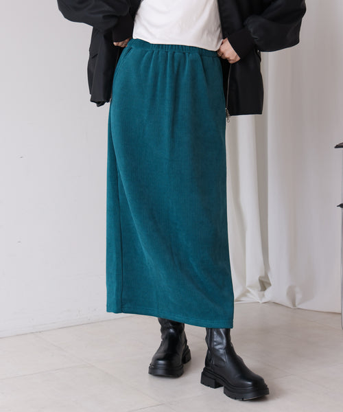 太めの畝が特徴のカットコールで仕立てた タイトスカート。何時でも着たくなるシンプルなシルエットで汎用性抜群です。タイトシルエットながら、ウエストはゴムの仕様で伸縮性もあり 普段使いにもオススメ。両サイドには便利なポケット付きです。裾にはスリットを配し動きやすさと抜け感をプラスしました。