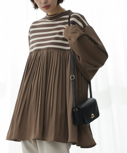 異素材ミックスが目を引くデザインのチュニック。 デコルテ下までは柔らかいニット素材で、ナチュラルな落ち感が女性らしい雰囲気を演出します。 切り替え部分からは、プリーツ加工が施された光沢感のあるブラウスをドッキング。 歩くたびにふわりと揺れる動きが、軽やかでエレガントな印象をプラスします。 袖はゆるっとしたドルマンスリーブで、着心地もラクラク。 ヒップまで隠れる長めの着丈で、体型を気にせずにサラッと着こなせます。 普段のデニムや細身のパンツに合わせるだけで、旬のスタイルが完成します。