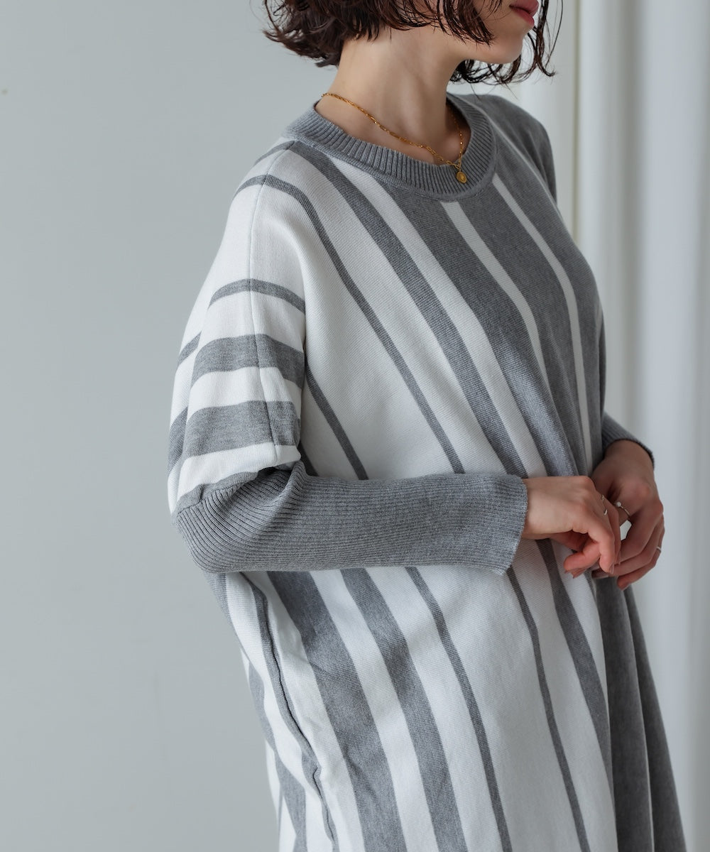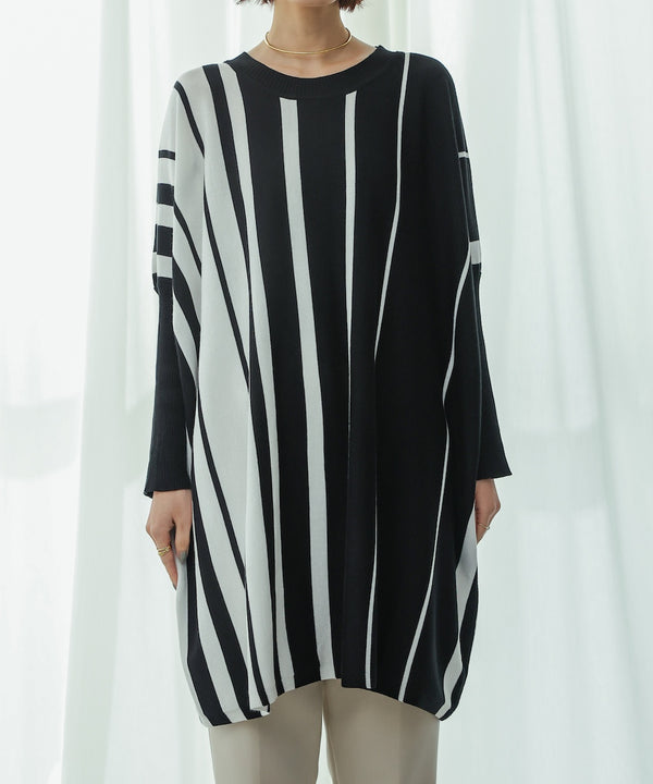 日常使いしやすい春まで使えるニットチュニック。 ランダムなストライプなデザインが、視覚的に動きのある印象を与え、シンプルながらも個性を感じさせます。 ボックスシルエットでゆったりとした着心地ながら、袖まわりはすっきりとしたラインでメリハリを作り、全体のバランスが絶妙。 薄手のニット素材なので、今すぐから春先までご着用いただけるアイテムです。
