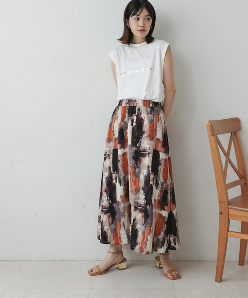 揺れるたびに気分を高めてくれるペイント柄スカート。 つやっとした揺れ感のある軽やかな素材と、個性的だけど柔らかい印象のペイント柄が目を引くスカート。柄のニュアンスが優しい印象を与え、華やかさと大人らしさを両立します。ロング丈なので安心感があり、スタイルアップ効果も期待できます。 ウエストの後ろ部分にはゴムを採用しているので、ストレスフリーな着心地。 さらに裏地付きで透け感を気にせず、どんなシーンでも安心して着用できます。トップスをインしてもアウトにしても映える万能アイテムです。