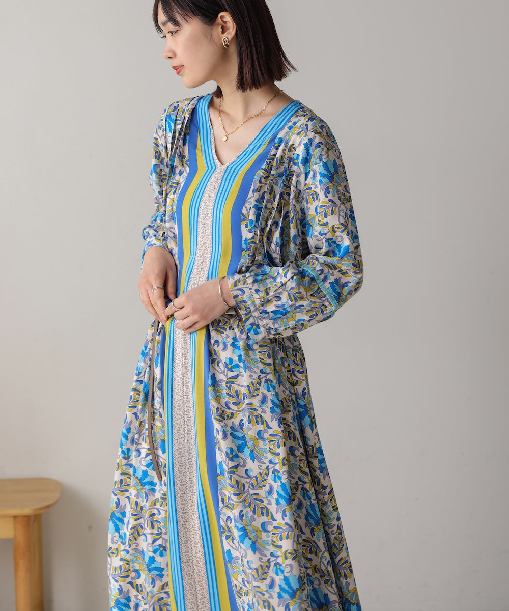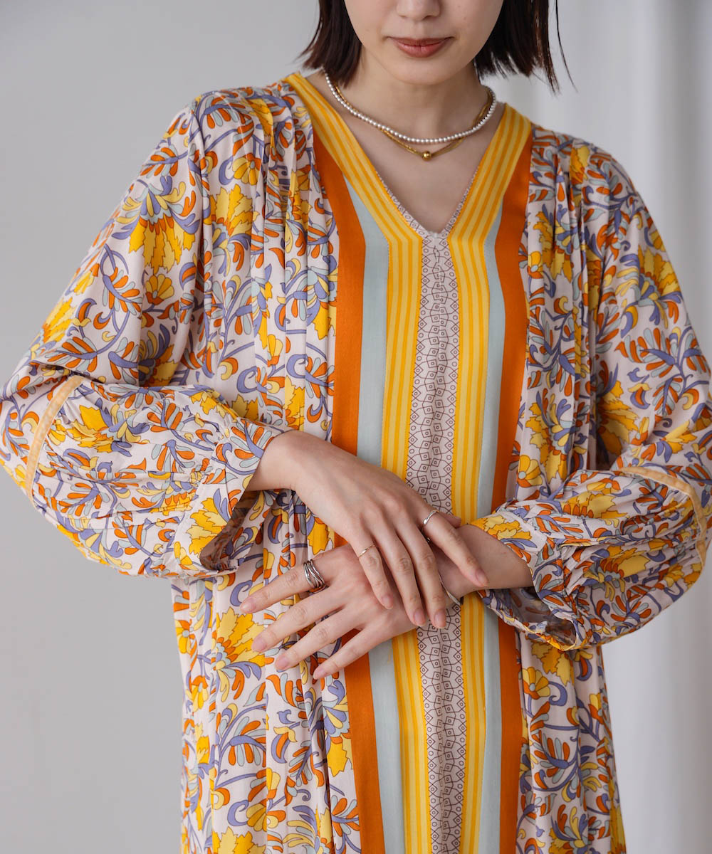 異国の風を感じるオリエンタル柄が、いつもの日常に彩りをプラスします。 さらっと軽やかな着心地で、暑い日でも快適に過ごせるのが魅力。 ロング丈なので、一枚でコーディネートが完成し、忙しい朝でも迷わずおしゃれが決まります。 胸元のギャザーと縦ラインのプリントデザインが視線を縦に流し、さりげなく細見えを叶えてくれるのも嬉しいポイント。 リラックス感がありながら、上品な雰囲気を演出してくれるから、夏のお出かけにぴったりの一枚です。