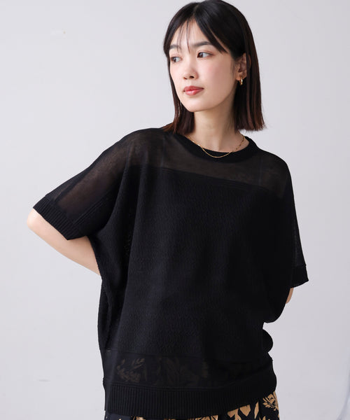 シアー感が大人のこなれを演出するサマーニットが登場。シルエットはシンプルにどんな体型の人にも合うサイジング、 肩回りや裾に透け感を持たせることでスッキリと細見えが叶います。ボディー部分は透けすぎないようにシアーを重ねたような 網目にしており、こまやかなデザインでシンプルなのに他と違った印象に。