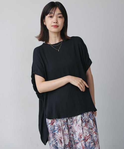 袖の折り返し涙あきのバックデザインがシンプルながら女性らしさを演出。 着丈も後ろを長めにしているのでしっかりお尻が隠れる仕様も嬉しいポイント。 暑さが厳しさを増す中、さらりと快適にご着用いただけます。