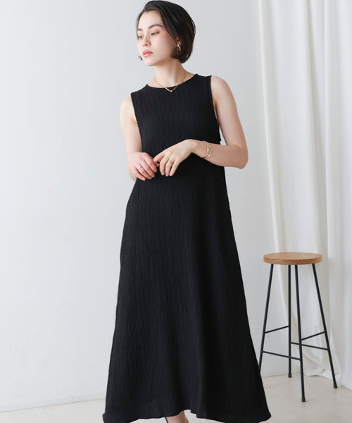 表面感のある、楊柳素材を使ったノースリーブワンピース。 共布のひもベルトがついており、ウエストを絞ってシルエットバランスを変えることもできます。 バックスタイルも程よい肌みせデザインで仕立てています。 ポケットつきも嬉しいポイント!