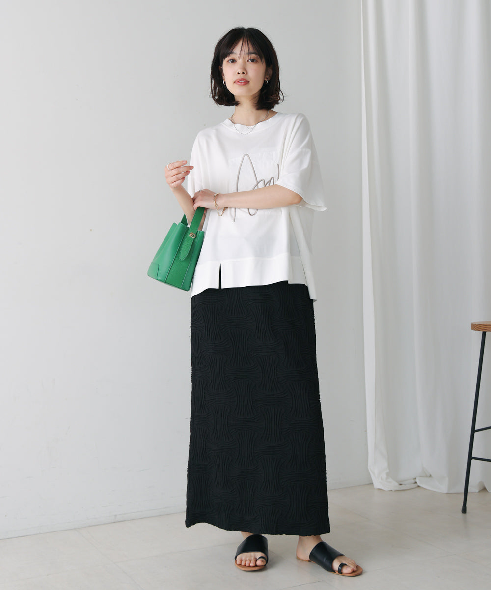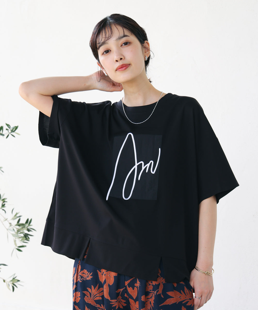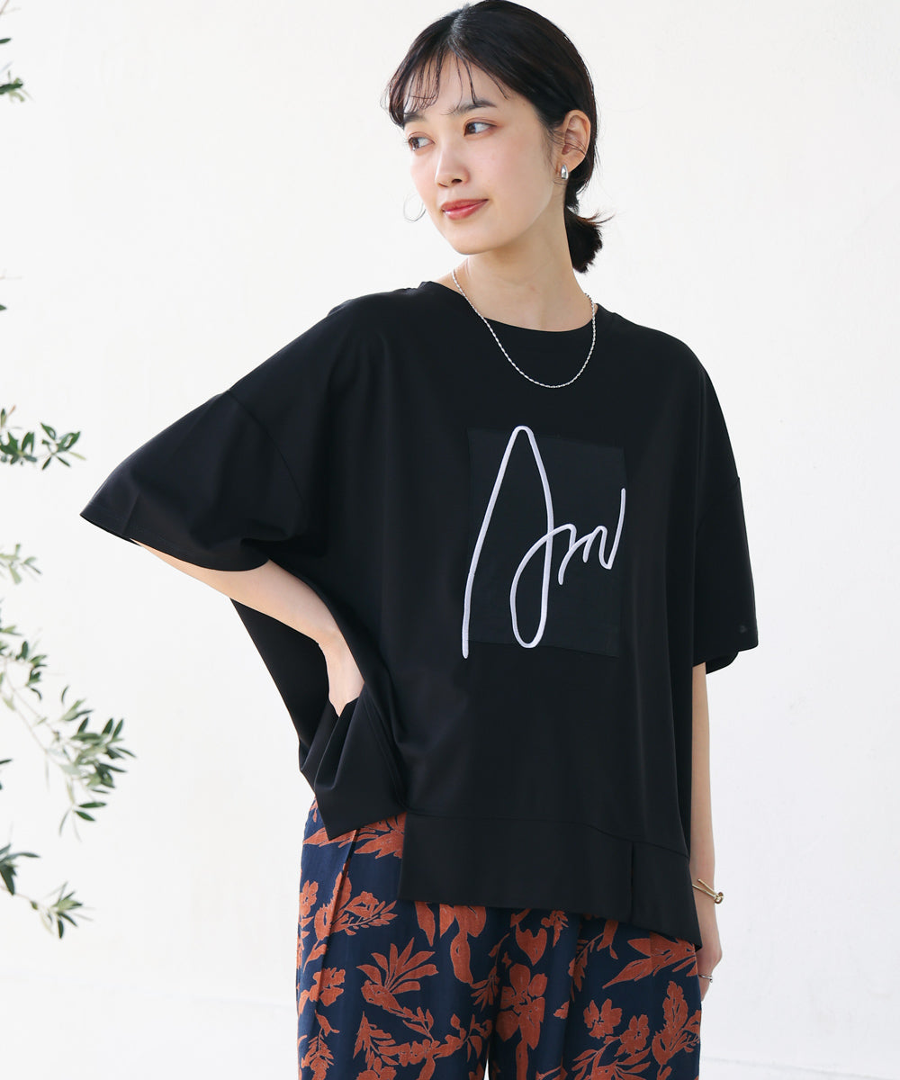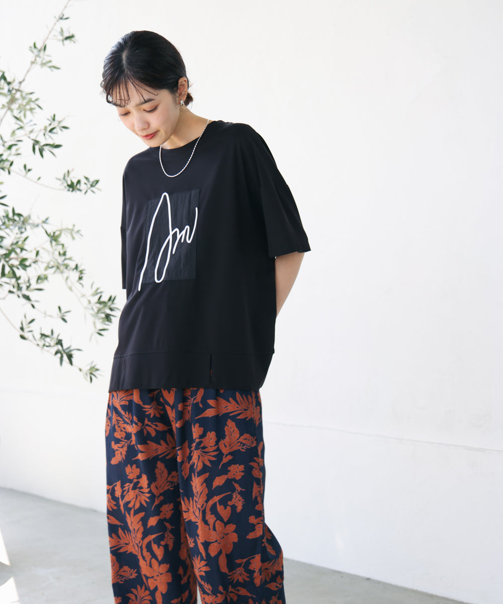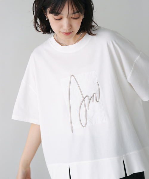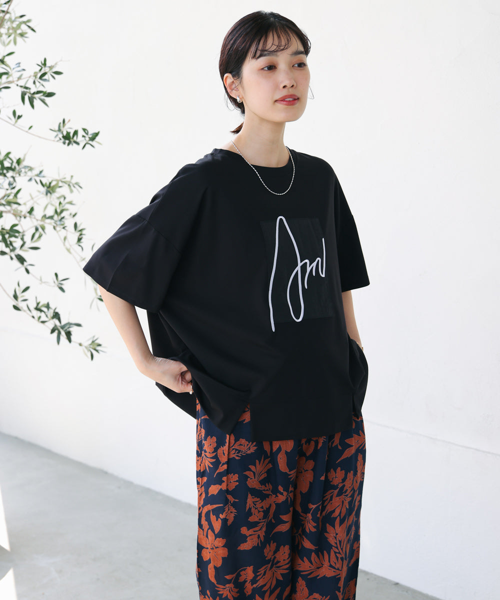 胸元の立体刺繍ロゴが魅力的な、大人のためのロゴTシャツ。肘まですっぽり隠れる五分袖丈とボックスシルエットで気になる部分をカバーしてくれつつ、程よいゆるさが一枚でこなれた雰囲気に決まってくれます。また、やや前方に入った裾のスリットが、コーディネートに抜け感を演出してくれ、さりげないスタイルアップも叶えてくれます。