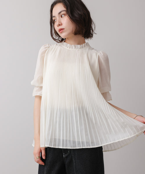 細やかなプリーツとフリルネックが女性らしいフェミニンなブラウス。 ふんわりと広がるシルエットは体型を拾わず、二の腕をさりげなくカバー。 前後2WAY仕様で、気分やシーンにあわせて着回しが楽しめます。