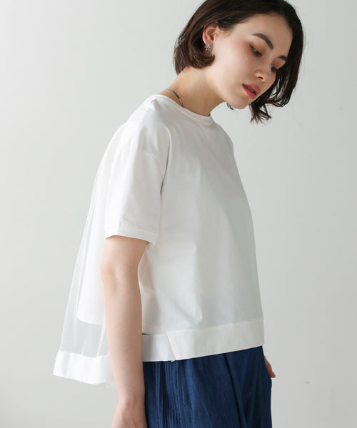 チュールの透け感が涼しげな後ろ姿までかわいいトップス。 後ろにチュール素材があしらわれたドッキングデザインのトップス。 動いた時の立体感とシルエットが後ろ姿を華やかに見せてくれます。 フロントはシンプルなので、前後で表情の違いを見せてくれ、カジュアルにもキレイめにも着られて、 デイリー使いにもおすすめ。