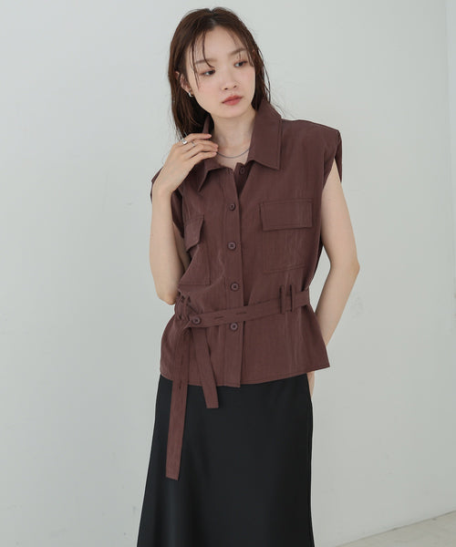 モード感漂うショルダーラインが魅力の、肩パッド入りベストトップス。構築的なシルエットで、いつものコーデにプラスするだけでぐっと洗練された印象になります。ウエスト位置にあるリボンがガーリーさをプラスし、甘辛MIXなベストになっています。