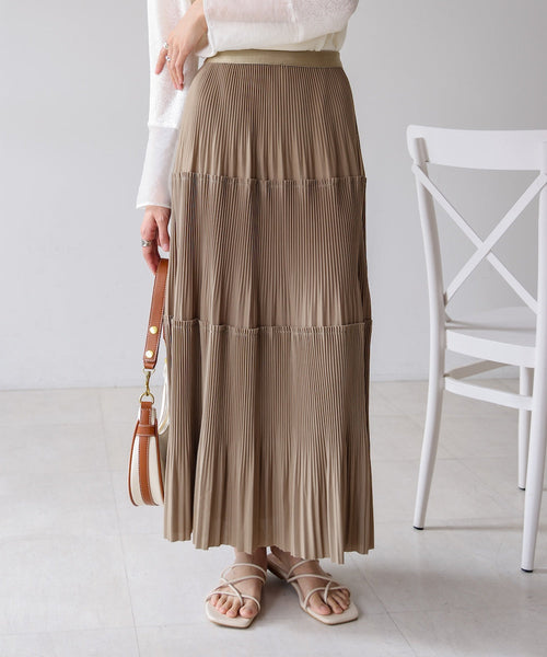 裾に向かって幅の違うリブが特徴の3段ティアード風プリーツスカートの登場。柔らかい生地感とウエストゴムでストレスフリーに着られるきれいめデザインです。程よい落ち感と動くたびに柔らかく揺れるシルエットでシンプルなトップスはじめ、長め丈やオーバーサイズトップスともマッチします。