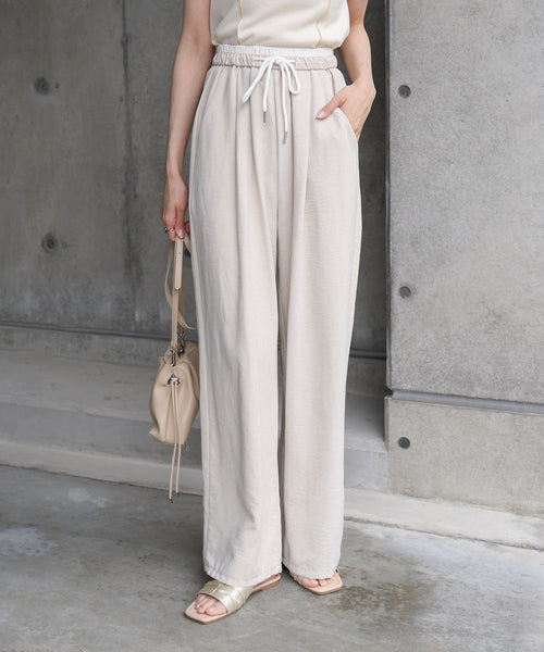 ウエスト部分にダブルデザインが施されていることで、スタイルにメリハリが生まれ、脚長効果のあるパンツの登場。肌馴染みの良いスキンカラーで、リラックス感がありながらも上品な印象を与え、ビーチやカジュアルなシーンにぴったりのアイテムです。ウエストゴムで楽な着心地も嬉しいポイント。