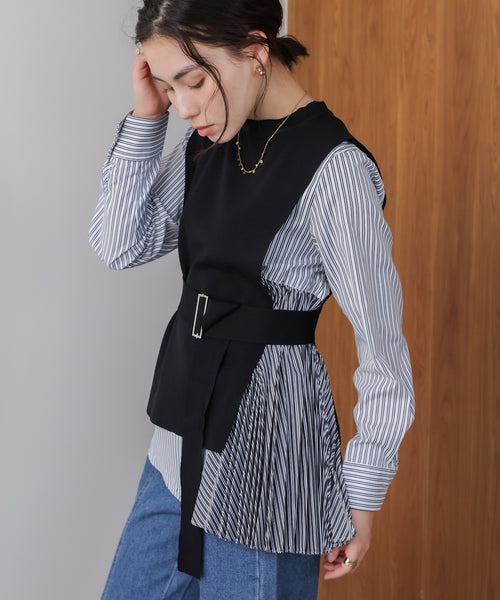 さらりとした素材とアシンメトリーがポイントのブラウスと、片方のサイドがざっくりとあいたベルト付きのベストがセットになったアイテム。ベストの片側からチラリと覗くプリーツデザインで、こなれ感を演出してくれます。ゆったりサイズで一枚でも決まるブラウス。ニットと同素材のベルト付きで着回し抜群です!