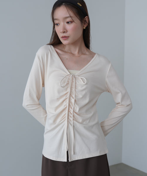 しなやかで落ち感のある素材感が、シャーリングの立体感を美しく引き立てます。肌触りは柔らかく快適で、伸縮性もあるためデイリーに着やすいのがポイントです。
