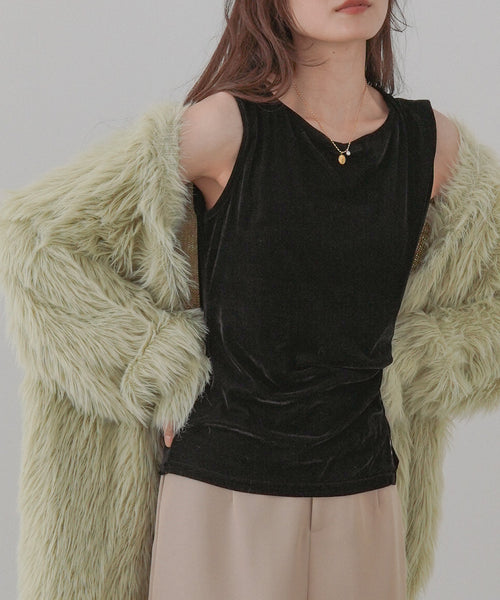 秋らしい光沢感をまとったベロア素材のタンクトップ。左サイドに寄せたギャザーがシンプルなシルエットに立体感を加え、フェミニンな印象を引き立てます。ミドル丈でボトムイン・アウトどちらも楽しめ、ジャケットやカーディガンのインナーとしても活躍。ノースリーブながらも季節感のあるベロア素材で、秋の着こなしを華やかに彩る一枚です。アイボリーは柔らかく上品に、ブラウンはクラシカルに、ブラックはシックにと、それぞれ大人っぽい雰囲気を楽しめます。