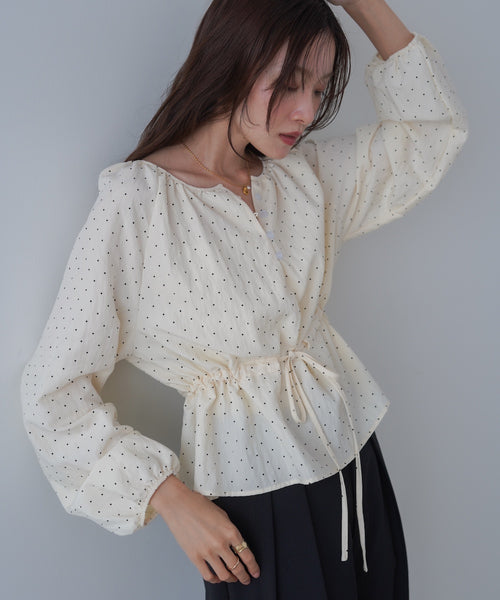 細かなドット柄とウエストのシャーリングが女性らしさを引き立てる、大人フェミニンなブラウス。フロントにはボタンが並び、腰回りにはリボンがあしらわれているため、自然にウエストマークされてすっきりとしたシルエットに仕上がります。甘すぎないドット柄と上品なディテールで、オフィスカジュアルにもぴったりの一枚。オン・オフ問わず着回し力の高いアイテムです。カラーはアイボリー・ブラウン・ブラックの3色展開。アイボリーは軽やかで華やかに、ブラウンは落ち着きがありクラシカルに、ブラックはドットが映えてシックな大人フェミニンに。色ごとに印象が変わるので、シーンに合わせて選べるのも魅力です。