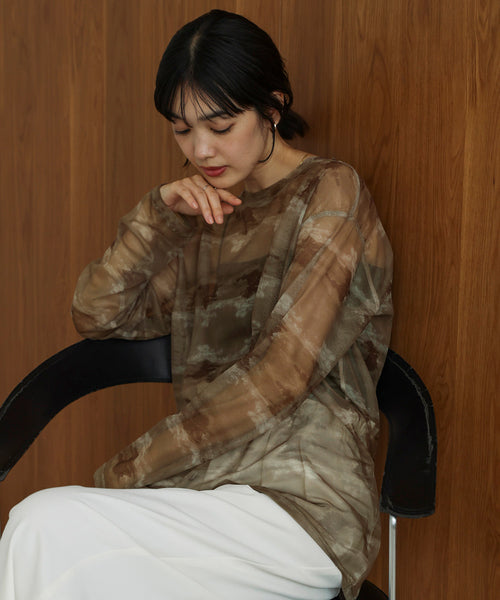 カラーごとに異なるニュアンス柄が、甘さを抑えた上品な表情をつくります。ほどよい透け感で抜けを出しつつ、首元はすっきり。体に張り付きにくいゆったりシルエットだから、体のラインを拾いにくいのも魅力です。インナー使いはもちろん、キャミを重ねてトップスとしても活躍。ワンピやジャケット、ニットの中に合わせてもバランスよく決まります。 ■FABRIC 薄手で軽やかなシアー素材。肌離れがよく、長時間も快適に着られます。やわらかな風合いが柄の陰影を引き立て、季節をまたいでレイヤードを楽しめる万能さもポイントです。 ■COORDINATE ………………… 透け感:あり 裏地:なし …………………