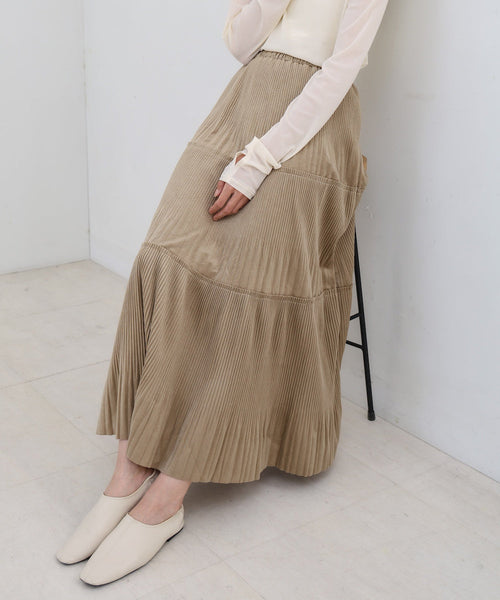 ベロアジャージー素材にプリーツを施した、3段ティアードスカート。着るだけで、程よい女らしい印象になります。上下2種類のプリーツを施しており、他とはちがうデザインになっております。腰周りはスッキリと見える分量にし、切替え部分から裾にかけて、きれいに広がるシルエットにこだわりました。裾は断ち切り仕様にして、ソフトな印象に。ウエストはゴムになっていて、ストレスのない履き心地に仕上げました。こっくりした色合いがこれからの季節にぴったりです♪立体感のある3段ティアードで、1枚で華やかさを演出できるデザインになりました。くっきりしたプリーツ加工で、動くたびに表情がかわる光沢感も魅力的◎。高級感がありながらイージーな総ゴム仕様で 気軽にお召し頂ける1枚です。