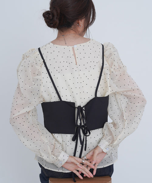 シアー感のあるドットブラウスと、ブラックのビスチェを組み合わせた華やかなSETアイテム。ブラウスはほんのり透ける素材感が女性らしく、袖にはギャザーを寄せることでふんわりとした立体感を演出。ビスチェを重ねることで甘さの中にメリハリが生まれ、大人っぽいフェミニンスタイルが完成します。ブラウスはアイボリー・ベージュ・ブラックの3色展開で、それぞれ異なる雰囲気を楽しめるのも魅力。アイボリーは軽やかで柔らかな印象に、ベージュは落ち着きのある上品な雰囲気に、ブラックはシックでクラシカルな着こなしに。特別感のあるデザインながらも、セットで着るのはもちろん、単品使いもできる着回し力の高い一枚です。