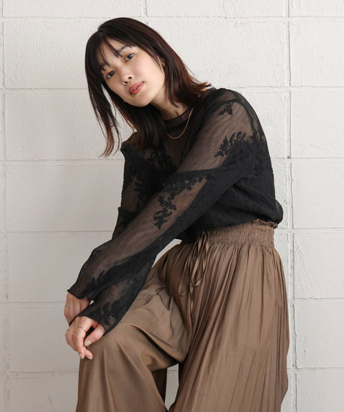 繊細で女性らしいデザインが目を惹く、着映える刺繍トップス。 柔らかく、肌触りの良い素材で着心地も良く、首元はどんなテイストにも合わせやすいクルーネック。一枚はもちろん、ジャケットやニットのインナーとしても活躍します。 秋冬の装いを華やかにアップデートする一枚です。