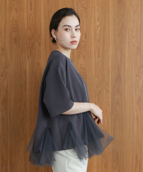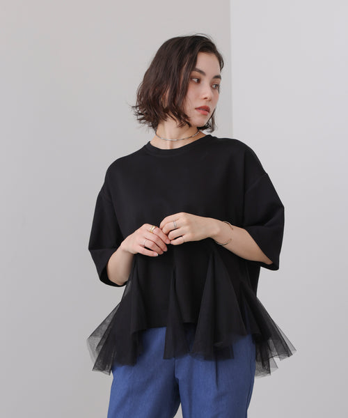 1枚で着映えて、程よいフェミニンを演出 裾チュールで華やかさと女性らしさを兼ね備えたチュニック。 チュールの素材感も程よい硬さで広がりすぎず、着たときのシルエットも綺麗! 同系色の異素材MIXなので、普段のコーディネートに取り入れやすく、程よい個性をプラスしてくれます。 ややゆとりのあるシルエットで、裾のチュールがヒップもカバーしてくれます。 柔らかく肌ざわりの良い素材感もポイントです。