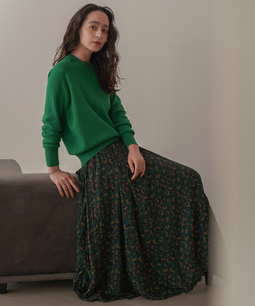 一気にシーズンムードが高まるプリントは抽象的なモチーフを使用。存在感がありつつも、幅広い人が取り入れやすい柄スカート。裾に向けて贅沢にたっぷりボリュームを出してドラマチックな揺れ感が魅力的。ウエストは総ゴムで楽ちんにお召し頂けます。