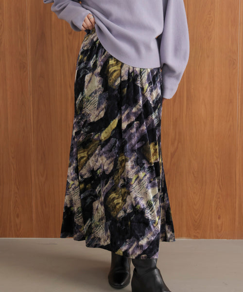 動くたびに表情が変わる、ニュアンス感のある柄が魅力の一枚。ベロアならではのマットなツヤが派手すぎず、いつものコーデをぐっとリッチに見せてくれます。落ち感のあるシルエットと後ろスリットで、自然に縦ラインを強調。ウエストは総ゴム仕様なので、きちんと感がありながらもストレスフリーなはき心地です。オンにもオフにも寄り添う、大人女子の頼れるスカート。