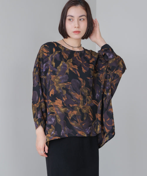 抽象的な柄にポイントでリーフを描いたアート柄ブラウス。ドルマンのシルエットとさらっと軽い素材感で、 季節の変わり目にも快適に着られるブラウスです。軽やかな素材ながら、秋らしい深みのあるカラーが印象的。 カーディガンやジャケットのインナーとしても映える一枚。