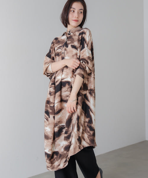 落ち着いたまだら柄が印象的なシャツワンピース。ポケット付きで実用的です。一枚で大人きれいめなカジュアルスタイルが出来上がります。ゆったりとした身幅とコクーンシルエットで体型カバーにも◎です。