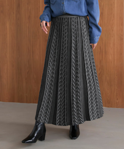 立体感のある編地が印象的なニットスカート。 ロング丈で女性らしい上品さと、裾に向かって広がるフレアシルエットで、デイリーにもお出かけにも活躍。 ウエストは総ゴムになっているので、そのままスポッと楽に穿いていただけます。