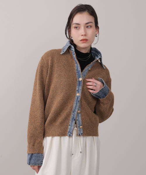 上品さと程よいカジュアル感を兼ね備えた、異素材ミックスのニットカーディガン。 柔らかなニットにデニム素材を効かせることで、シンプルながらも表情のある一枚に仕上げました。 コンパクトな丈感でバランスが取りやすく、スカートにもパンツにも好相性。 さっと羽織るだけで、こなれた大人のスタイリングが完成します。