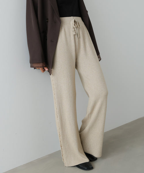 サイドに揺れるフリンジが目を惹く、デザイン性のあるニットパンツ。同色のフリンジが動くたびに表情を出し、スタイリングにさりげない個性をプラスします。フロントの飾りリボンがポイントになり、カジュアルながらもほんのり甘さのある印象に。伸びのある素材でリラクシーな履き心地ながら、きれい見えも叶う優秀アイテムです。