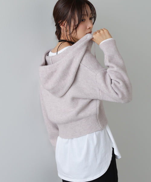 コンパクトなシルエットが今っぽい、ショート丈のフーディーニット。カジュアルなデザインながらも、やわらかな質感と程よいボリューム感で大人っぽく仕上がる一枚です。フードの紐をきゅっと絞れば顔まわりに抜け感が生まれ、ゆるめればリラックスムードに。休日のおでかけにも、通勤後のオフスタイルにもぴったりなこなれ見えアイテムです。