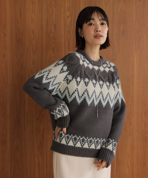 大胆なジャカード柄が上品に映える、大人なニット。 落ち着いた柔らかい配色でまとめることで、可愛らしすぎずエレガントな印象に。 ゆとりのあるシルエットが体型を美しくカバーしつつ、こなれ感のあるスタイリングが完成します。
