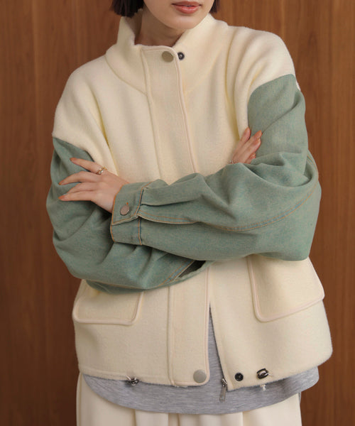 トレンドの“ミニマル×ワーク”を掛け合わせた、ショート丈のスタンドカラーブルゾン。袖にデニム素材をコンビ使いすることで、カジュアルな抜け感と程よいアクセントをプラスしました!スタンドカラーが顔まわりをシャープに見せ、ジップを開閉することで表情を変えられるのも魅力。ショート丈ならではのバランスで、ウエスト位置が高く見え、自然とスタイルアップ効果が狙えます。さらに、裾にはドローコードを使用しており、シルエットをストレートにもふんわり丸みのある形にも調整可能で、スタイルアップを叶えるシルエットアレンジ性を加えました。存在感のある一枚で、デイリーからお出かけまで幅広く活躍します!