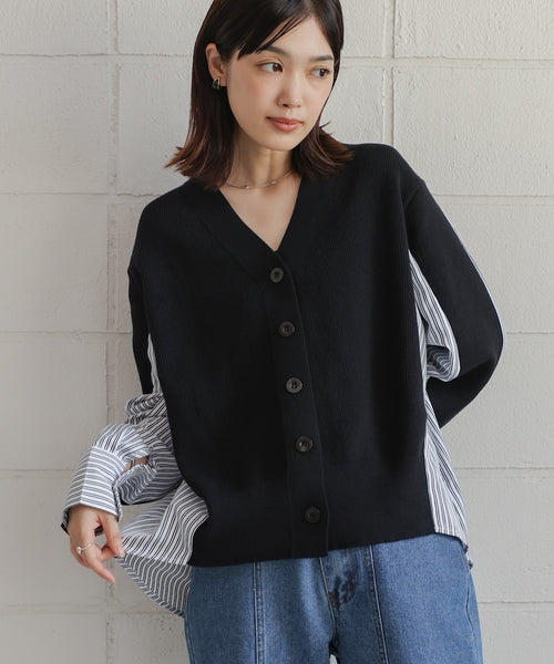 バックストライプデザインが目を惹く、着映えする一着。 やや肉厚の生地には若干のハリがあり、どこか上品できれいめな印象にも仕上げてくれます。 身幅に余裕を持たせたボックスシルエットで、身体のラインをひろいにくく、 二ットとストライプの視覚効果で、細見え効果抜群。 大きめのボタンもかわいく、正面から見たときのポイントとなりスッキリ見せてくれます。 ボタンを全て開けて、Tシャツやシアーインナーを中に入れるのはもちろん、 程よい開きのVネックなので、プルオーバーとして着用するのもおすすめです。