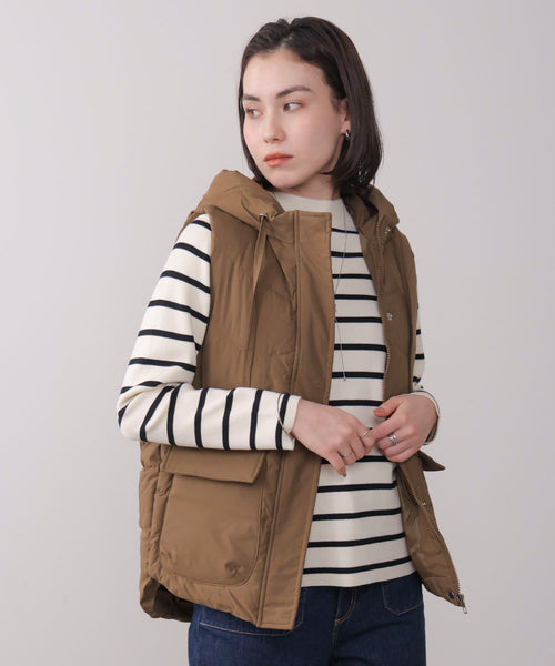 軽やかな着心地が魅力の中綿フードベスト。 程よいボリューム感で着膨れせず、さっと羽織るだけで季節感のあるスタイリングが完成します。フード付きデザインがカジュアルになりすぎず、コーデに程よい抜け感をプラス。 ヒップにかかる安心丈で体型カバーも叶えつつ、パンツにもスカートにも合わせやすい万能アイテム。アームホールにゆとりがあり、厚手トップスの上からでもストレスフリーな着用感です。 季節の変わり目から真冬のレイヤードまで、長く活躍する一着です。
