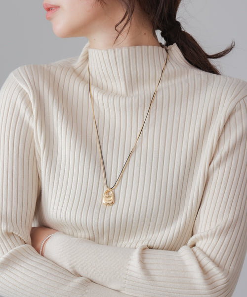 丸み帯びたフォルムのゴールドチャームが特徴的なネックレスです。 華奢なゴールドとブラックのコードが重なり、動くたびにさりげない輝きをプラスします。 軽くて着け心地が良く、日常使いはもちろん、特別なシーンのコーディネートにもおすすめ。 シンプルながら存在感のあるデザインで、首元を上品に彩ります。