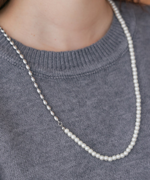 繊細なパールと華奢なメタルチェーンを組み合わせた、上品なネックレスセット。 ひとつでシンプルに、重ね付けで華やかに —— 気分やコーデに合わせて表情を変えられるのが魅力です。 小粒パールのやわらかな艶が、首元を女性らしく上品に演出。 Tシャツやニットのカジュアルスタイルはもちろん、ワンピースやきれいめコーデにも自然に馴染み、毎日のスタイリングをワンランクアップしてくれます。 デイリーから特別な日まで幅広く活躍する、ひとつ持っておきたい万能アクセサリーです。