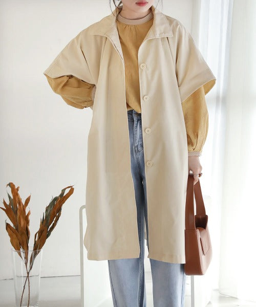 ケープをまとったようなデザインで、さっと羽織るだけで洗練された上級者見えするコート。袖口が広めなので、身幅があるトップスや袖にデザインがあるトップスも余裕で着用できます。衿元のボタンを閉めればトレンドのスタンドカラーにも出来るので、また違った印象に。ベルト付きでウエストをきゅっと絞って頂くと、スタイルアップ効果も◎重さもなくストレスフリーにご着用頂けるのも嬉しいポイント。レイヤードスタイルを楽しんで頂けるアイテムです。