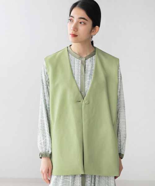 すっきりとしたネックラインが上品なフェイクレザーのショートベスト。