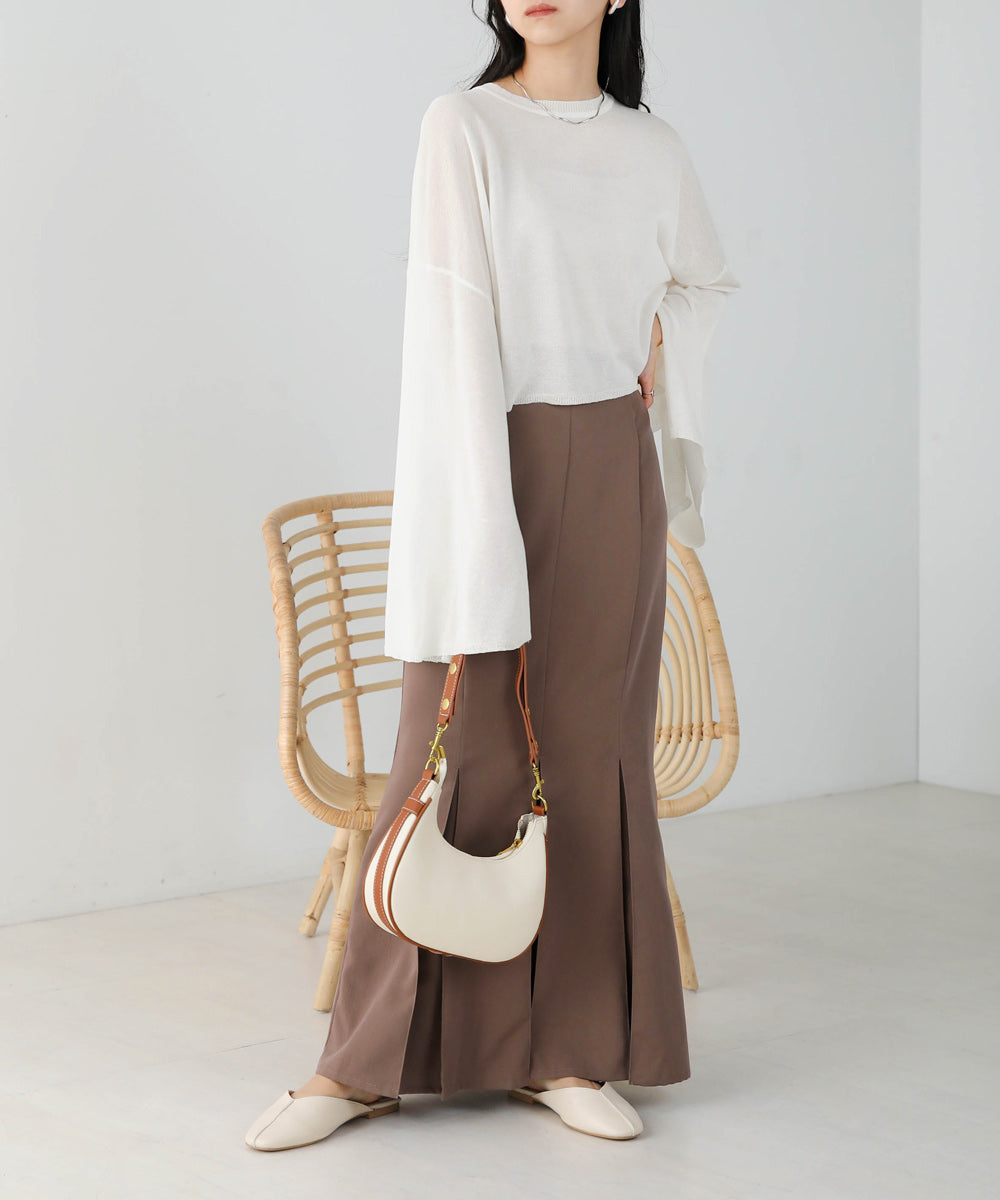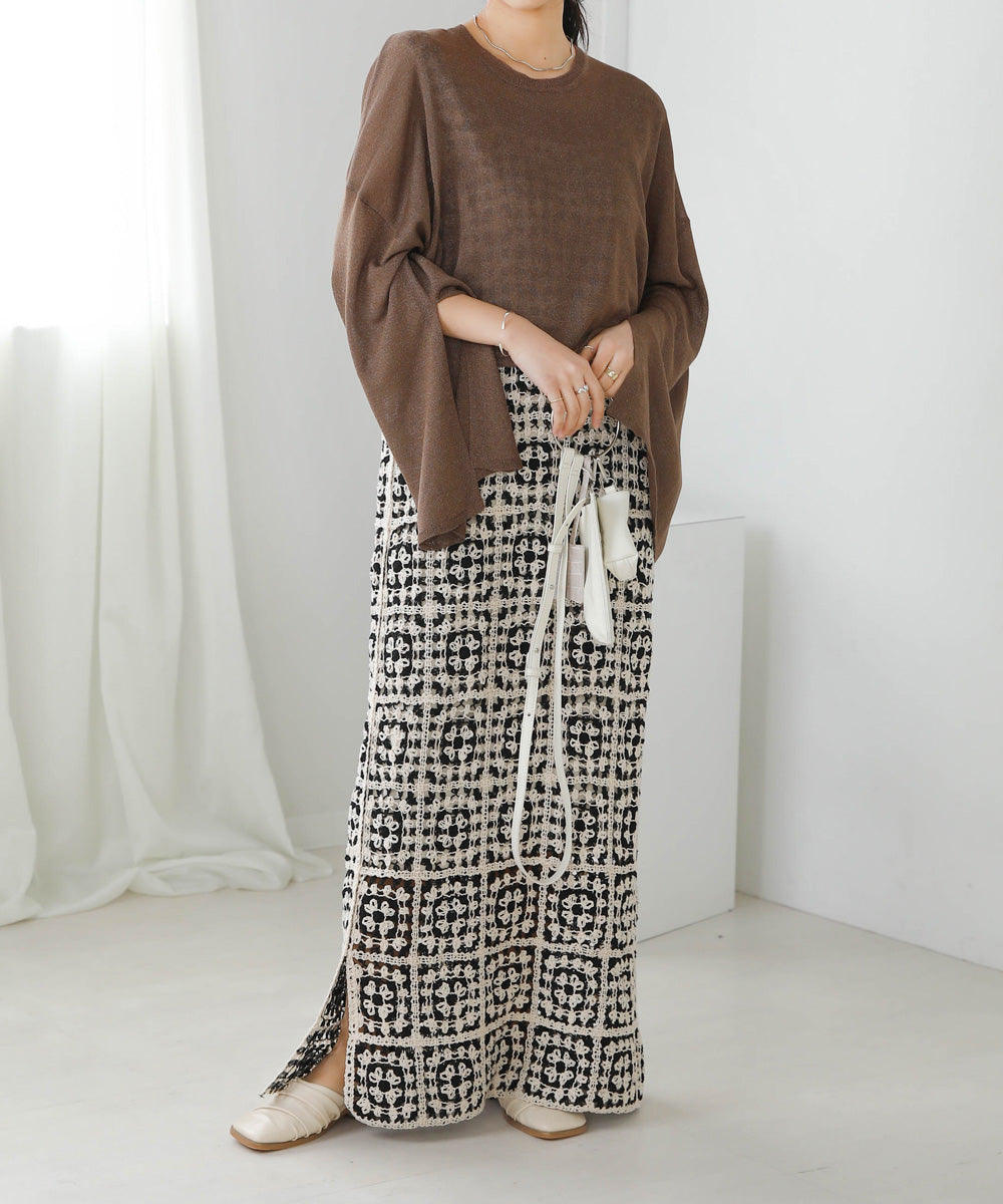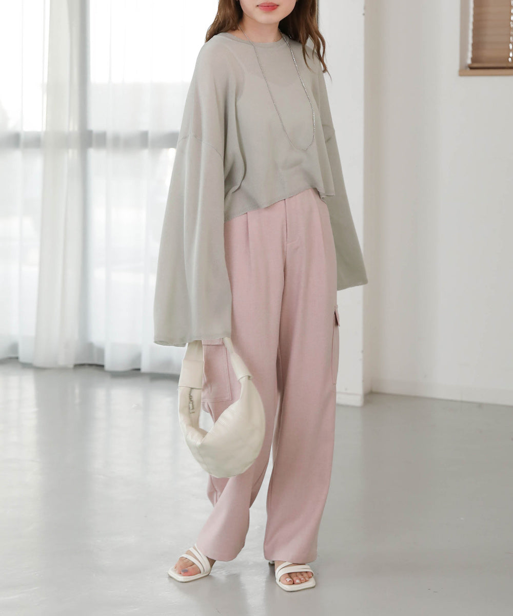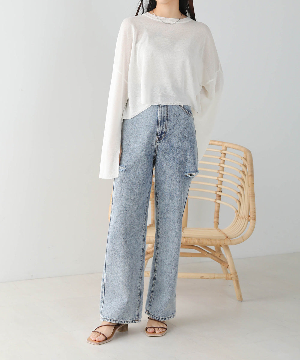 ゆるっとしたシルエットがこなれ感を出してくれるシアーニット。袖幅は広く、スリットが入っているので今年らしい仕上がりに。程良い透け感+強すぎないラメ糸を使用しているので、春夏らしい爽やかな印象になります。腰あたりの丈感で、脚長効果も抜群!◎シンプルながらもトレンドをしっかり押さえられる万能アイテムです♪