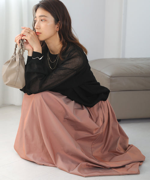 ウエストにタックを入れ、腰回りはすっきりと裾にかけてふんわりと広がるラインが特徴。