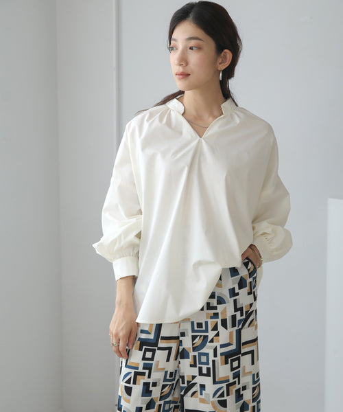 シンプルなアウトラインのシャツに、 バックシャンディティールをいれたデザインシャツ。 後ろにはたっぷりとギャザーをよせて分量感をだして、 女性らしい柔らかい雰囲気に◎ 1枚で様になるけどやりすぎないディティールが大人っぽい印象です。 衿はシンプルなバンドカラーで、顔回りをスッキリと見せてくれます。