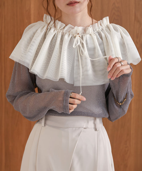 いつものスタイルに取り入れるだけでトレンド感をプラスできるチュールのつけ襟が登場しました。襟元につけて小顔効果を発揮するのはもちろん、ビスチェ風に胸元に配置したり、たすき掛けにしてコーディネートのポイントにもできるマルチなデザイン。適度なボリュームで旬なフェミニンスタイルを叶えるアイテムです。アジャスターでの長さの調節も可能です。