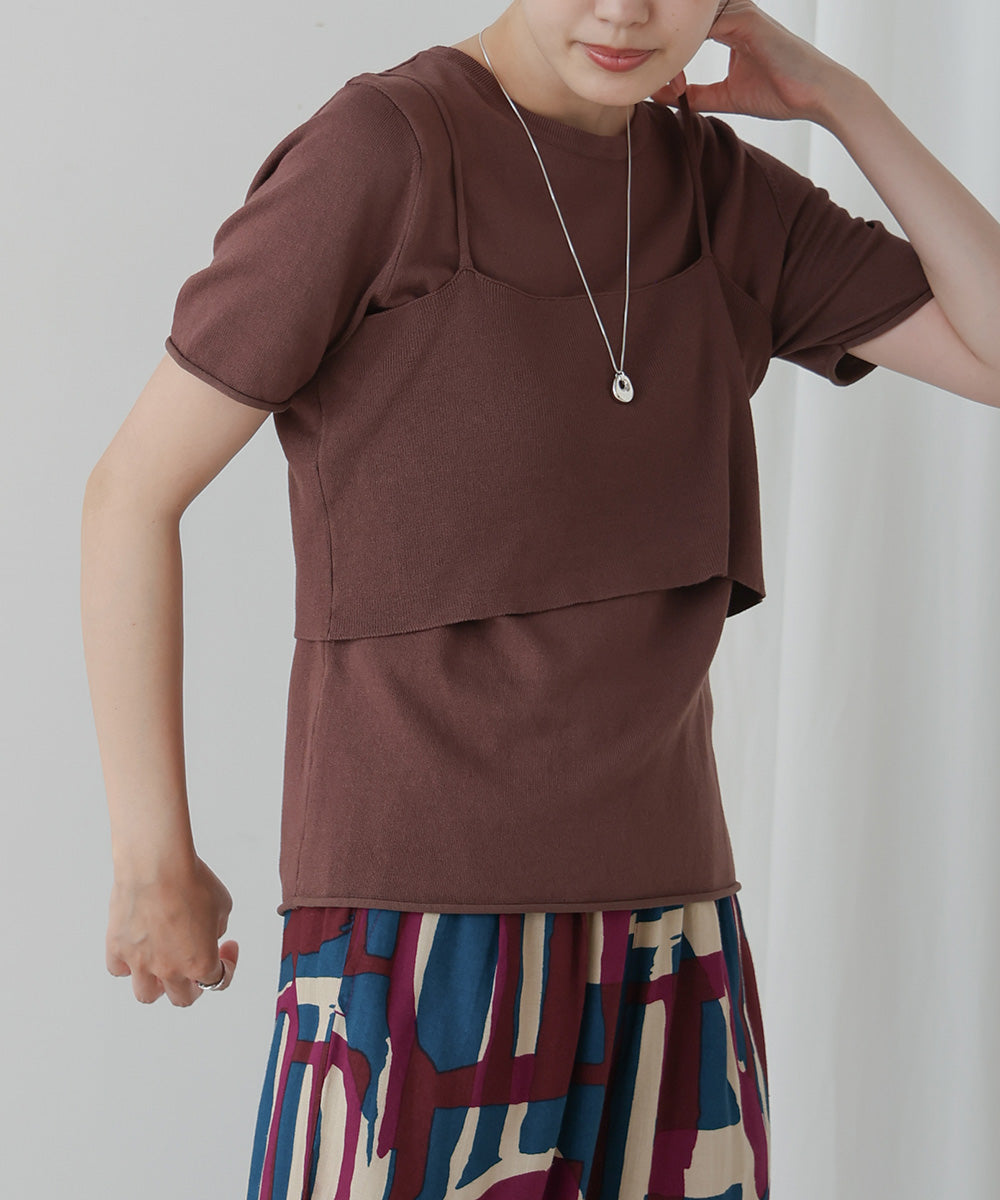 落ち着いたオータムカラーのニットはこれからの季節にピッタリはまるカラー展開です。 キャミをレイヤードする事でトレンドをさり気なく取り入れ、気になるウエスト周りもしっかりカバーできます。