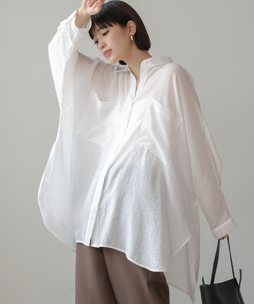 シンプルなシャツに少しシアー感を取り入れたブラウスは、レーヨンを使用することでしっとりとした 落ち感のある大人な雰囲気に仕上げました。 羽織としてもシャツとしても両方お使いいただけます。