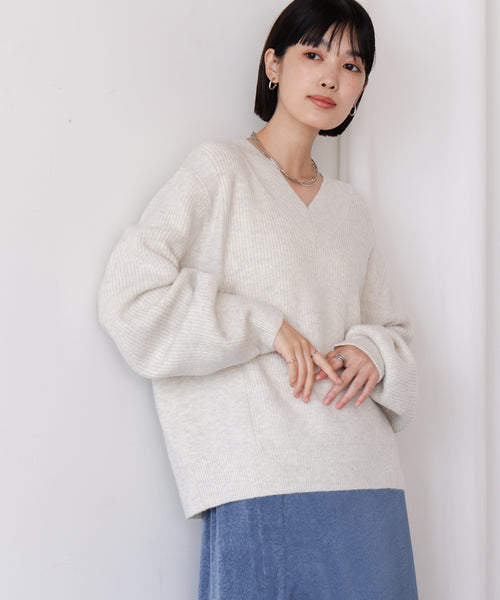 一枚で首回りがスッキリ見えるVネックニットです。 柔らかい生地を使用し、脇部分は編地を変えることでシルエットにもこだわった一枚です。