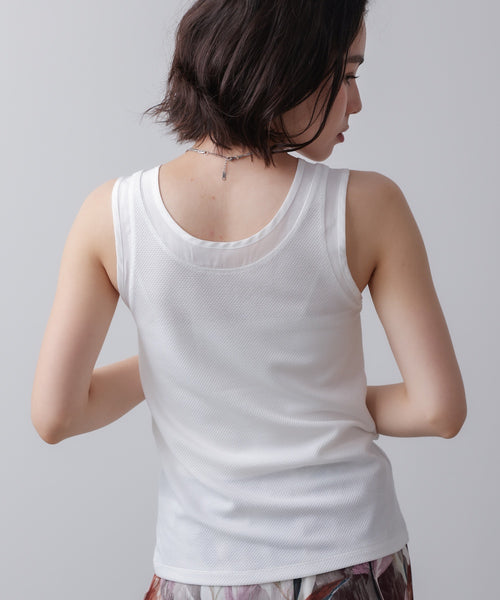 前後2wayで表情がかわり変り編カットソータンク◎ Vネックとクルーネックの使い分けが可能なので、 コーディネートにあわせて使い分けができて便利! 衿ぐり部分には布帛素材を使用してほどよくデザインをいれているので、 見えても手抜きに見えないディティールが◎